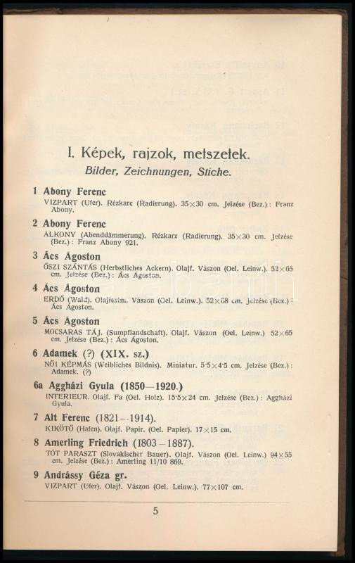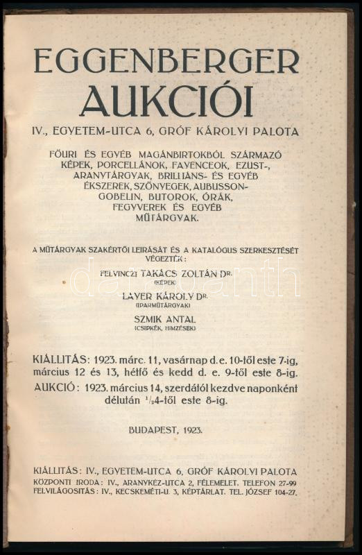 Felvinczi Takács Zoltán, Layer Károly, Szmik Antal (szerk.): Eggenberger aukciói I. Főuri és egyéb magánbirtokból származó képek, porcellánok, fayenceok, ezüst-, aranytárgyak, brilliáns- és egyéb ékszerek, szőnyegek, aubusson-gobelin, butorok, órák, fegyverek és egyéb műtárgyak. Bp., 1923, Wodianer Nyomda. Magyar és német nyelven. 128 p. + VIII t. (fekete-fehér képek, többe közt Barabás Miklós, Zichy Mihály és Székely Bertalan műveinek reprodukcióival). Kiadói papírkötésben, gerincén apró sérüléssel, jó állapotban.