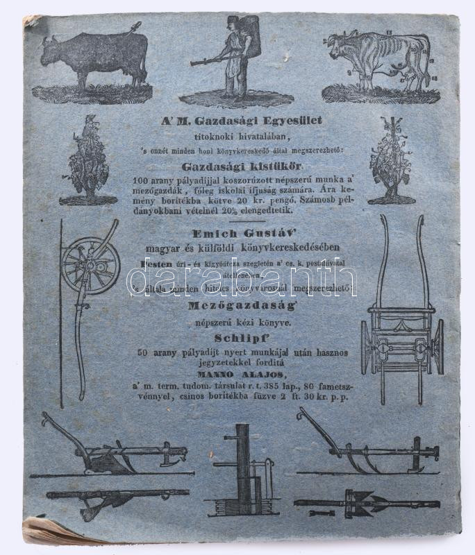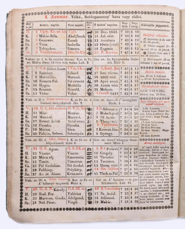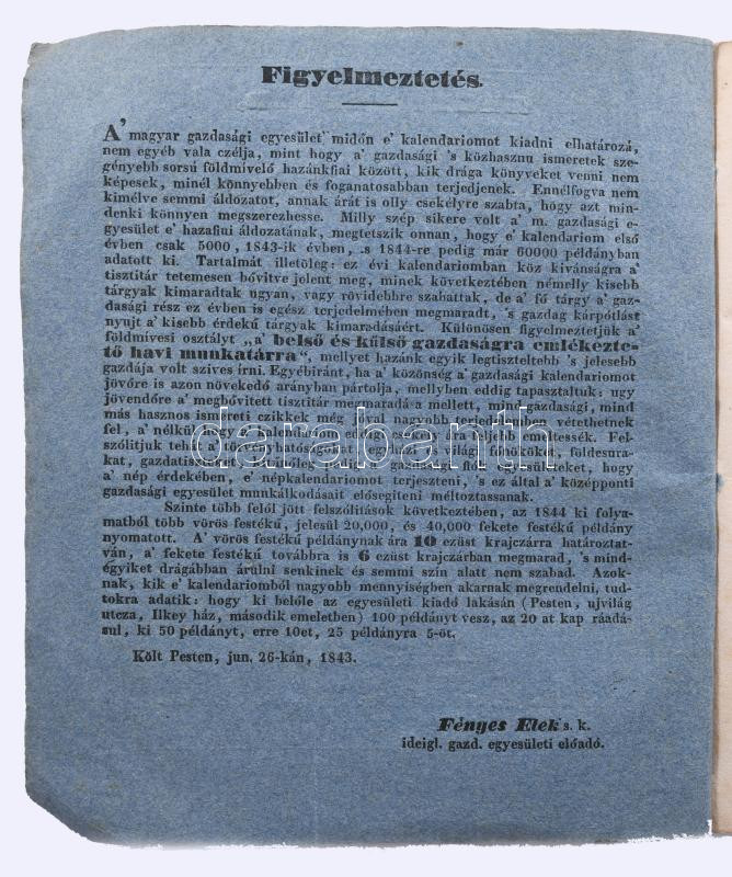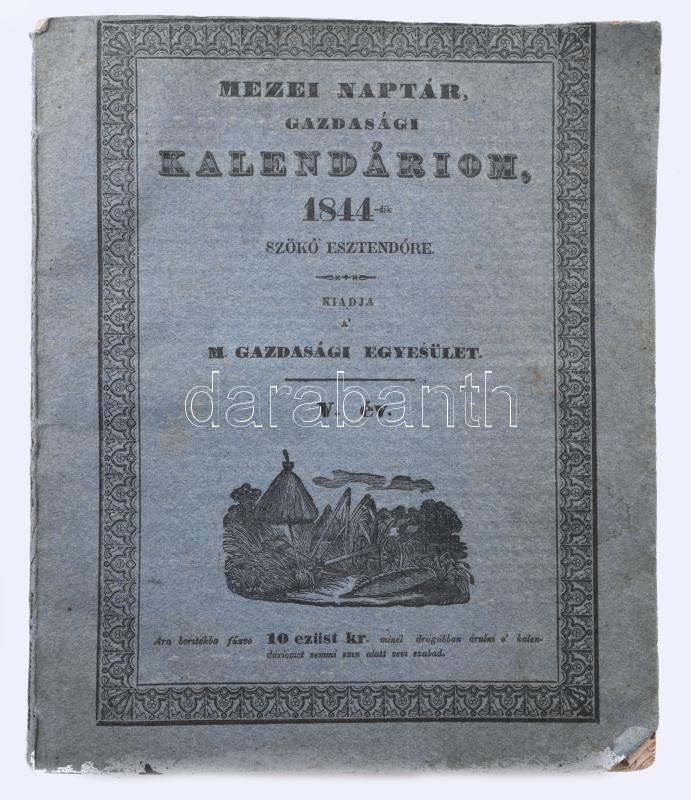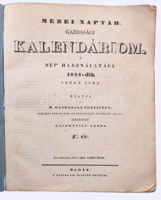 Mezei naptár, gazdasági kalendáriom. A nép használatául 1844-dik szökő évre Kiadja a Magyar Gazdasági Egyesület. Szerk.: Kacskovics Lajos. V. év. Illusztrált kiadói papírborítékban Budán, (1843.) Magy. Kir. Egyetem? bet. 68 p. 3 sztl. lev. + 6 üres levél. (jegyzeteléshez). Emlékeztető havi munkatár ( gazdák teendői az adott hónapra) Uralkodóház tagjainak névsora Ügyvédek névsora - lakásuk címe Magyarországi vármegyék gazdasági tanácsok Az állatok ápolása gondviselése Közönséges tanácsok kamatot mutató tábla