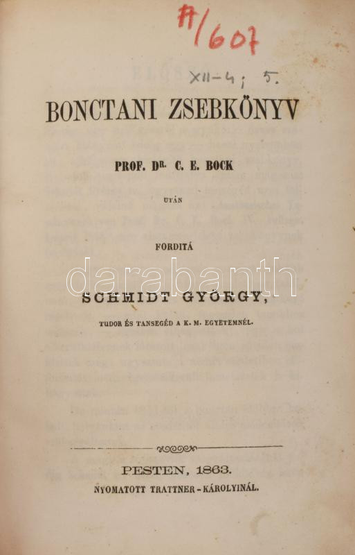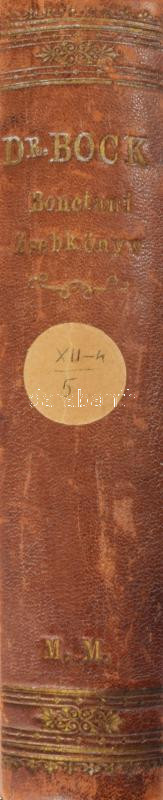 [Bock, Carl Ernst (1809-1874)] Prof. Dr. C. E. Bock: Bonctani zsebkönyv. Ford.: Schmidt György. Lenhossék József előszavával. Pest, 1862., Trattner-Károlyi, VII+572+LXXXIX p. Későbbi félbőr-kötésben, a gerincen magánkönyvtári címkével, márványozott lapélekkel, kopott borítóval, kissé foxing foltos lapokkal, orvostanhallgató névbejegyzésével ("Mihájlovits Miklós orvosnövendék 1879") és ceruzás aláhúzásaival és bejegyzéseivel.