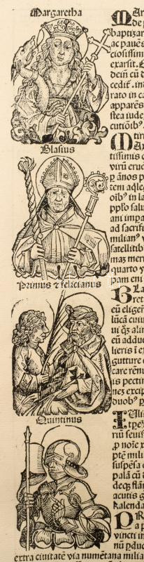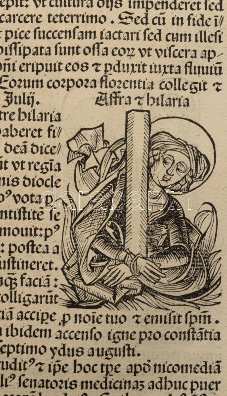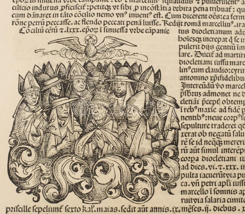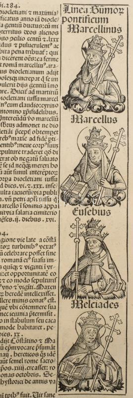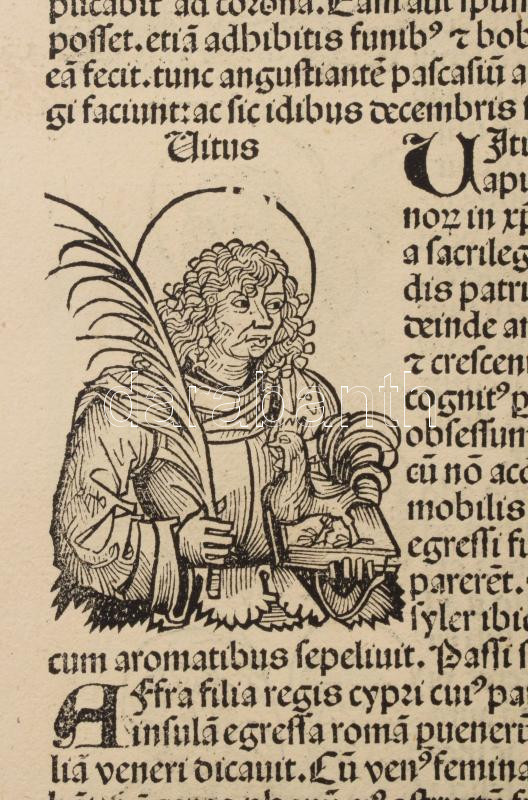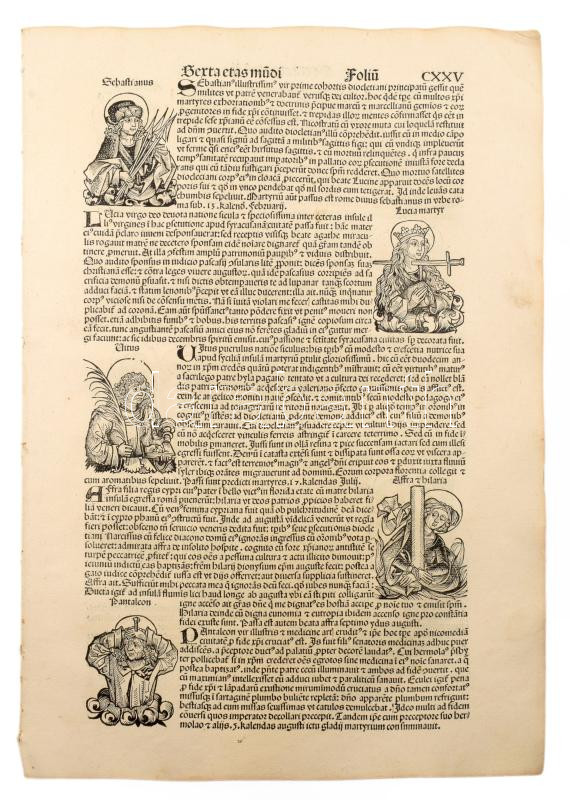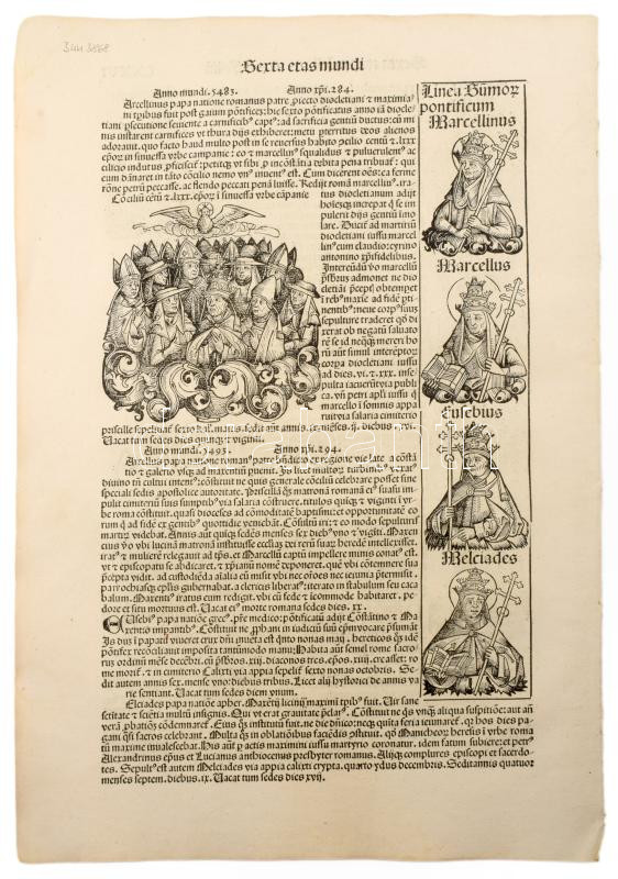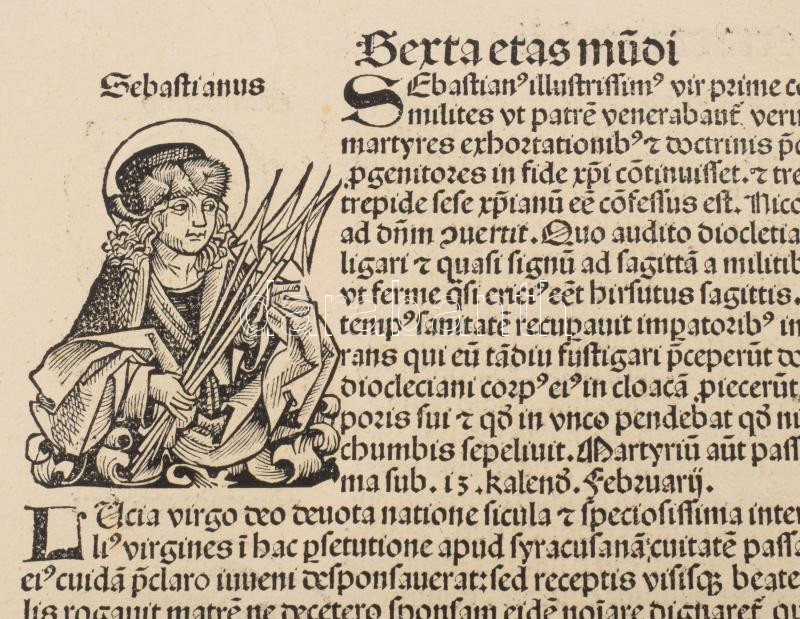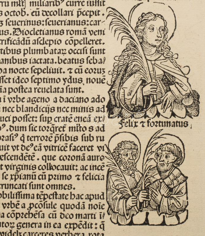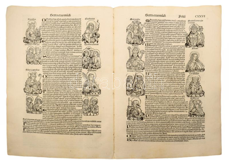 1493 Ősnyomtatvány - a híres Schedel krónika két egymást követő lapja (egybefüggő lappárja) , rajta középkori uralkodók szentek, és egyházi méltóságok fametszetű képével. A személyek között szerepel többek között Szent Lúcia az egyik legismertebb keresztény mártír, akit a katolikus, ortodox és anglikán egyházak is tisztelnek. Szent Lucia szicíliai vértanú, aki szüzességi fogadalma miatt szenvedett mártírhalált. A legenda szerint kivájt szemeit is visszaadta neki Isten, ezért a látás és a vakok védőszentje, neve a fény-ből ered, ünnepe december 13. 1493.-ban jelent meg az első nyomtatott világkrónika, amelyben Buda legrégibb hitelesnek tekinthető látképe is fennmaradt. A könyvnek számos magyar vonatkozása is van. A mintegy 600 lapos, nagyméretű ősnyomtatvány a 15. századi könyvművészet kimagasló emléke. A Lapok mérete egyenként 32x46 cm. Művelődéstörténeti és könyvtörténeti kuriózum. RITKASÁG!