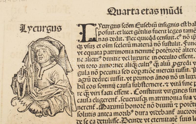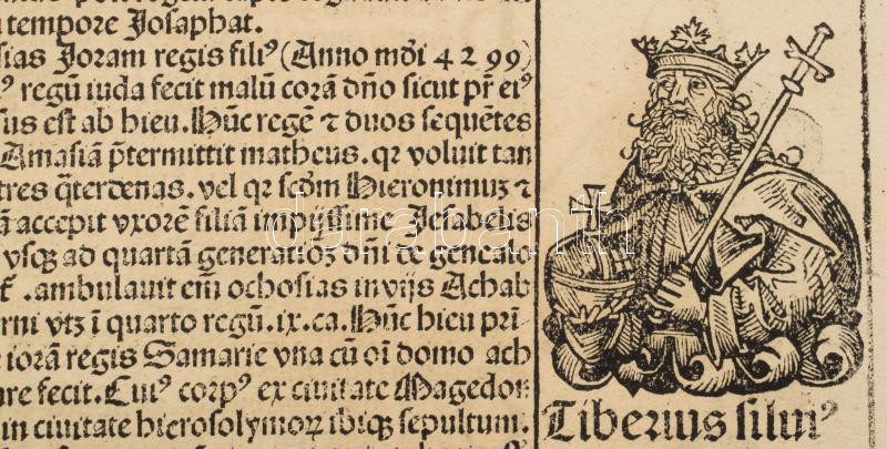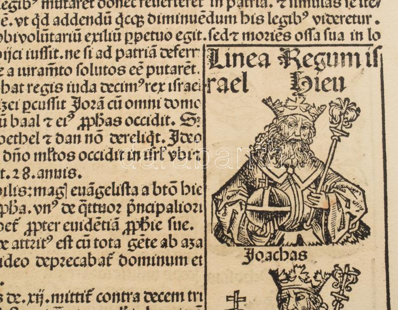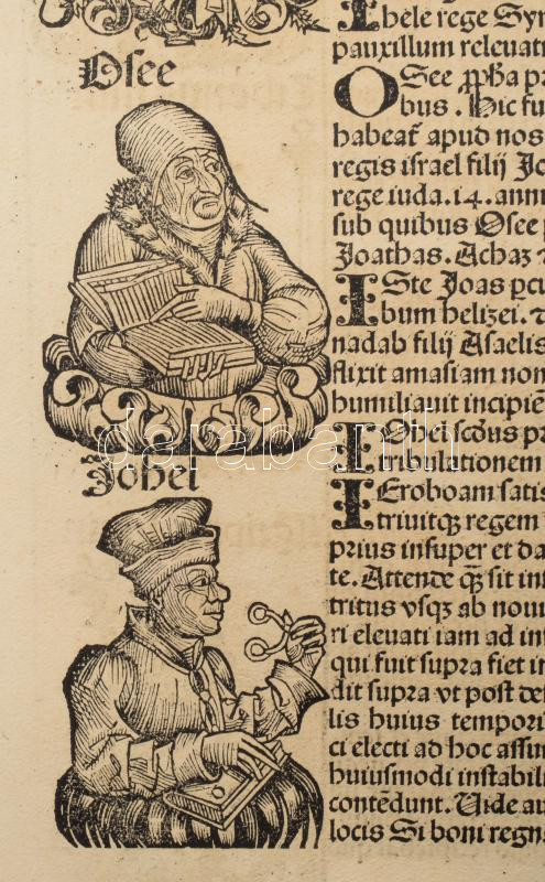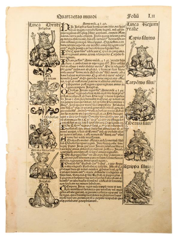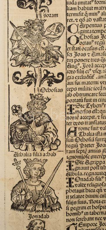 1493 Ősnyomtatvány - a híres Schedel krónika lapja, rajta középkori uralkodók és egyházi méltóságok fametszetű képével. A lapon érdekes Bibliai tárgyú leírások, melyben a szerző leírja Júdea királyának Jóásnak (Jehoás) történetét, aki Áházia király fiaként született. Amikor nagyanyja, Atália kiirtotta férjének és fiának minden leszármazottját, hogy a trónt megkaparintsa, a 3 éves Joást nagynénje, Josába megmentette, és férjével, Jójáda főpappal együtt titokban, saját fiukként nevelték fel. 1493.-ban jelent meg az első nyomtatott világkrónika, amelyben Buda legrégibb hitelesnek tekinthető látképe is fennmaradt. A könyvnek számos magyar vonatkozása is van. A mintegy 600 lapos, nagyméretű ősnyomtatvány a 15. századi könyvművészet kimagasló emléke. A Lap mérete 32x44 cm. Művelődéstörténeti és könyvtörténeti kuriózum. RITKASÁG!