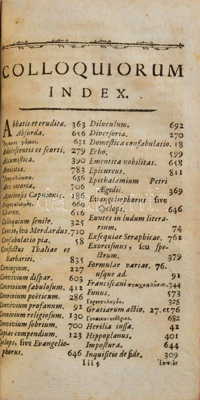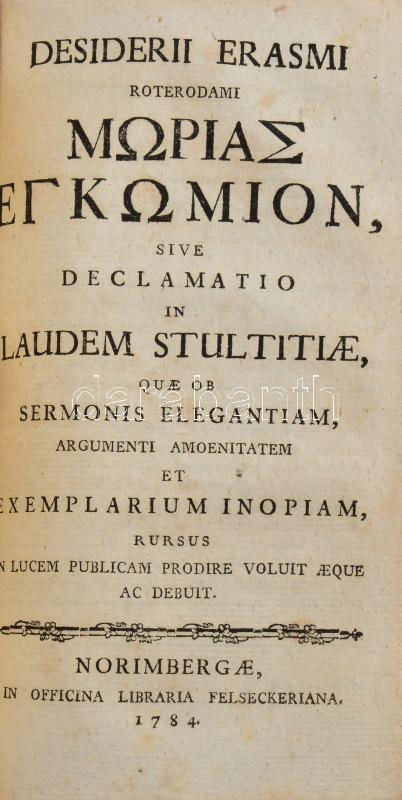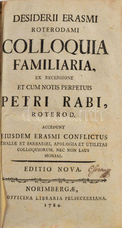 Desiderius Erasmus Roterodamus: Colloquia familiaria, ex recensione et cum notis perpetuis Petri Rabi, roterod. ... Editio Nova. Hozzákötve: Moriae Encomium, sive declamatio in laudem stultitiaae, quae ... Norimbergae, 1784, In Officina Libraria Felseckeriana, 8 sztl. lev. + 872 p.+ 12 sztl. lev. + 88 p. Latin nyelven. Korabeli aranyozott gerincű félbőr-kötés, festett lapélekkel, kopott , foltos borítóval, sérült gerinccel, az elülső szennylapon kis sérüléssel, hiányzó elülső előzéklappal.