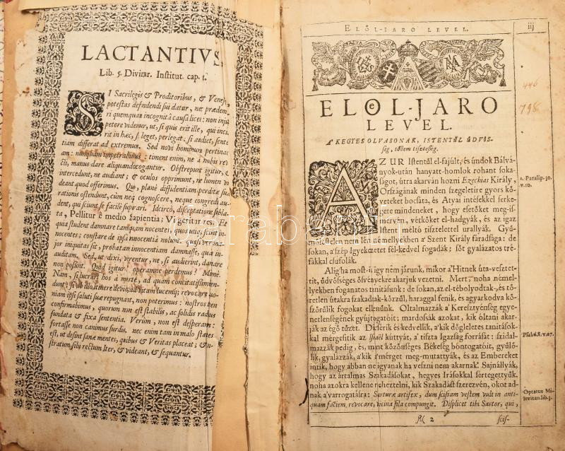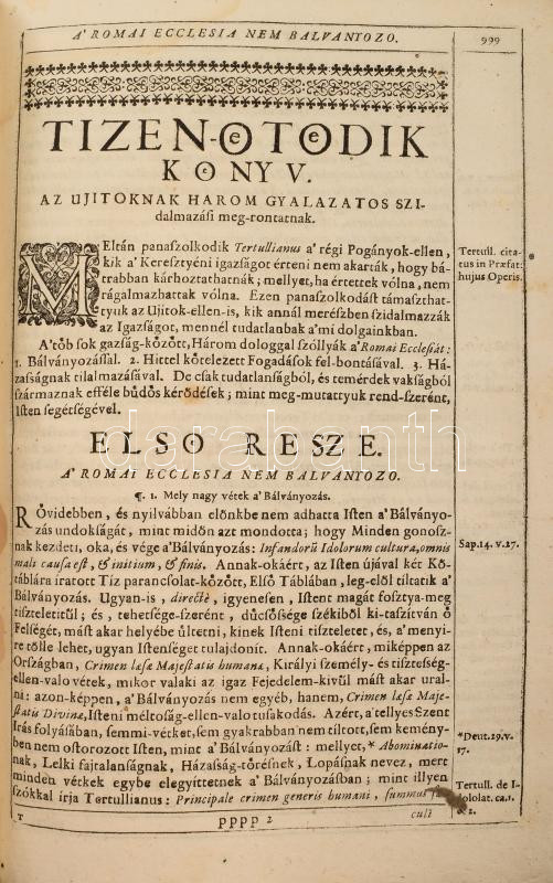 Az RMNy két változatát ismeri. A ?B? változat címlapját és utolsó levelét a XVIII. században nyomtatták. Az utolsó lap hiányzik, de a címlap alján nem található meg a "Találtatik Nagyszombatban" megjegyzés. Ebből következik, hogy a példányunk a teljes egészében 1637-ben készült (gyakoribb) ?A? variáns. RMNy 1697., RMK I 673. Korabeli aranyozott gerincű álbordás egészbőr-kötés, festett lapélekkel, kopott borítóval, a hátsó borítón sérülésekkel, hiányzó kapcsokkal, a gerincen kis sérülésekkel, sérült címlappal, a címlapon bejegyzésekkel, a szennylapok és az első 6 lap és az utolsó 4 lap restaurált, a címlapot követő 5 restaurált lapon sérülésekkel, néhány lap sarkán szöveget nem érintő kis hiánnyal, foltos lapokkal, az utolsó 2 levélen autográf bejegyzésekkel, az utolsó lap hiányzik (a 2 jegyzetlap előtt.)