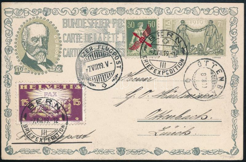 1919 Díjjegyes képeslap Pax és Repülő bélyeges kiegészítéssel, légipostával Zürichbe / Mi 145 on PS-card, airmail to Zürich