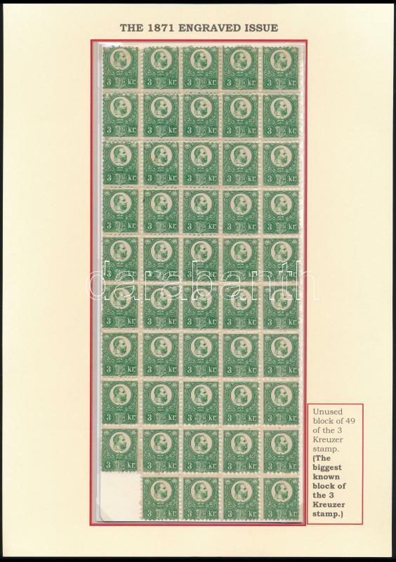 Description: 1871 Réznyomat 3kr POSTATISZTA 49-es ívdarabban, kiállítási lapon. Ebből a bélyegből ez a legnagyobb ismert összefüggés, rendkívül ritka! (pár helyen falccal megerősítve)