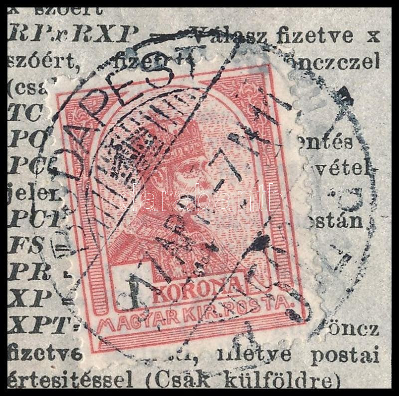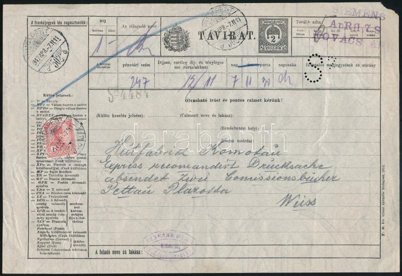 1917 Ritka 2f díjjegyes távirat Turul 1K bérmentesítéssel, Siemens S7 lyukasztással / Siemens 2f PS-Telegram (S7) with 1K additional franking "BUDAPEST"