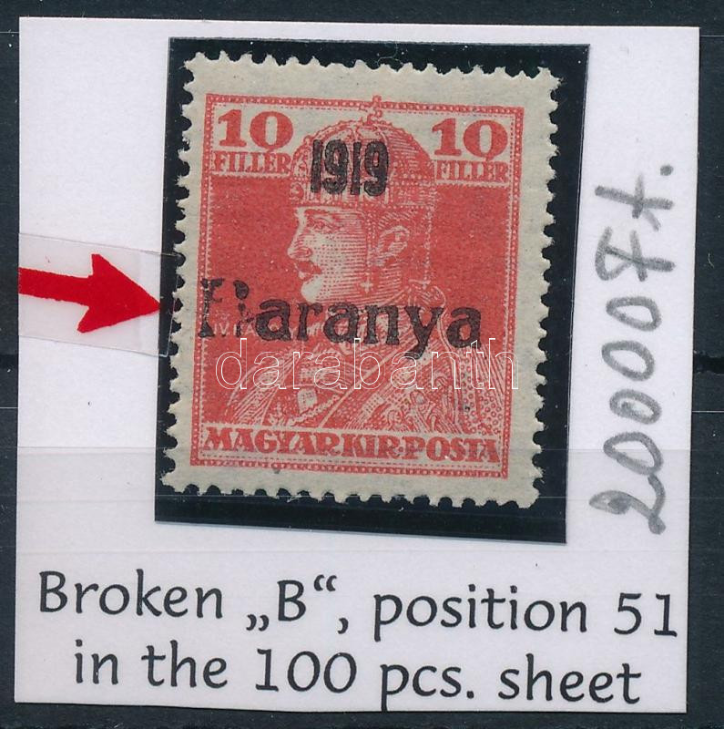 https://www.darabanth.com/en/45-Major-auction/45.1/Hungarian-philately-and-postal-history-Live/Occupation-and-local-issues-1919-1921-Baranya~18581/Baranya-I-1919-Karoly-10f-lemezhibaval-with-plate-variety3Cbr-3E-Signed-Bodor~II3451103