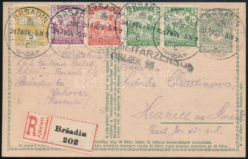 1917 Ajánlott cenzúrázott díjjegyes levelezőlap 5 bélyeggel kiegészítve / Registered censored PS-card with additional franking "BRSADIN"