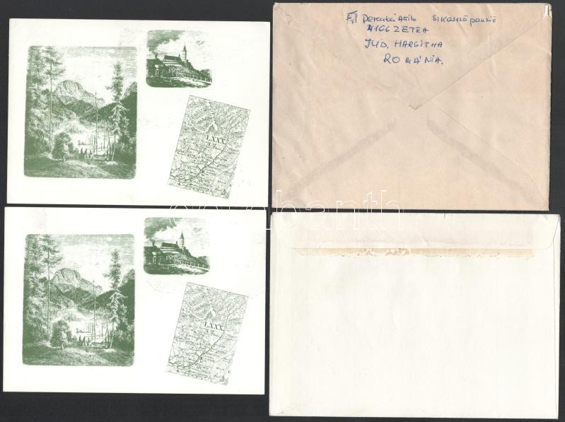 Description: 1992 2 db képeslap és 2 db levél Erdélyből a Sikaszó panzióból küldve román és magánposta bélyegekkel / 1992 2 postcards and 2 covers from Transylvania sent from the Sikaszó guesthouse with Romanian and private postage stamps