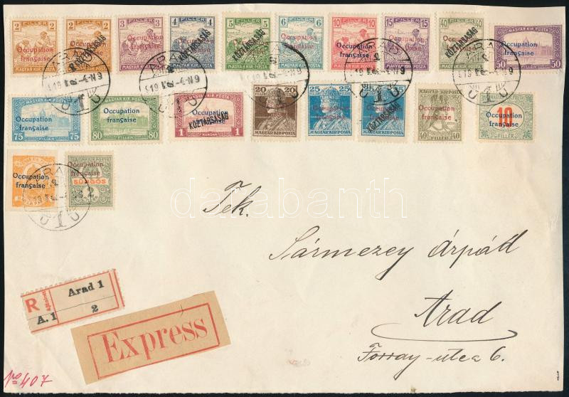 Description: 1919 Arad helyi ajánlott expressz levél előlap 20 klf megszállási bélyeggel / Local registered express cover front with 20 different stamps