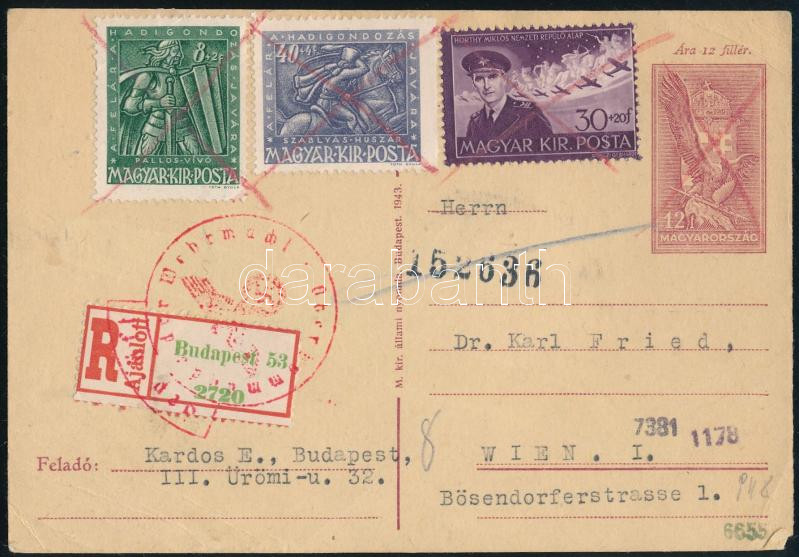 1943 Ajánlott cenzúrázott levelezőlap áthúzott díjjeggyel és bélyegekkel Bécsbe / Registered censored postcard