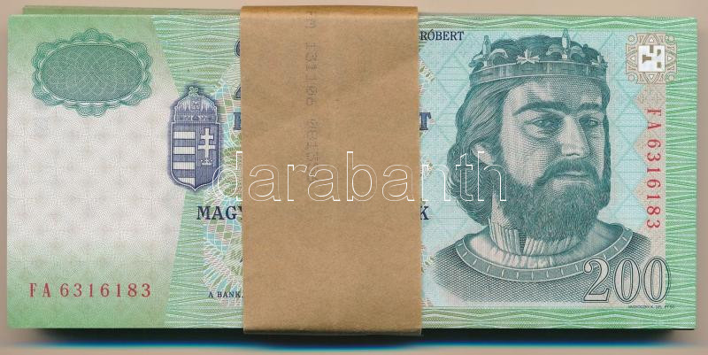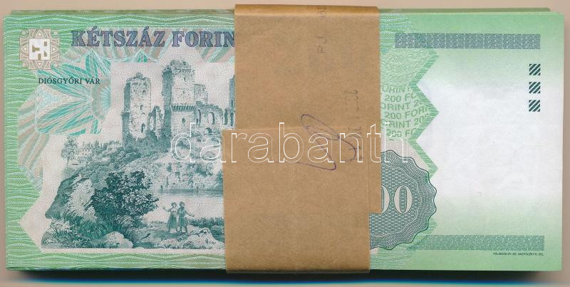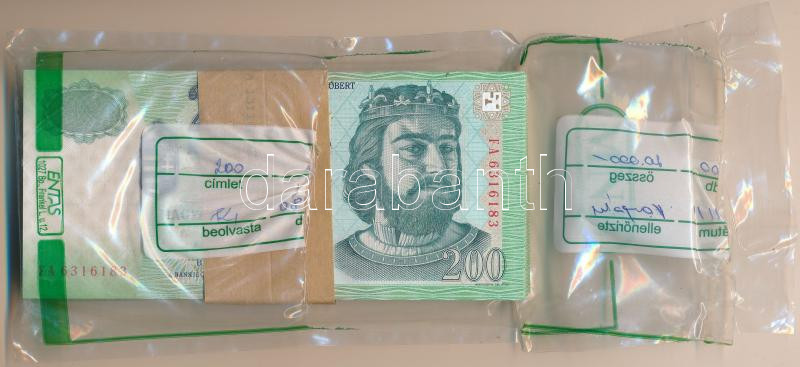 2006. 200Ft (100x) eredeti banki kötegelővel, eredeti, bontott "MNB" zacskóban. Több részletben sorszámkövetők: "FA 6316183 - FA 6316200" + "FA 7616150 - FA 7616198" + "FA 7516101 - FA 7516129" T:UNC,AU, a köteg egy része vágáshibás / Hungary 2006. 200 Forint (100x) with original bank currency strap, in original, opened "MNB" (Hungarian National Bank) bag. Consecutive serials in several parts: "FA 6316183 - FA 6316200" + "FA 7616150 - FA 7616198" + "FA 7516101 - FA 7516129" C:UNC,AU, part of the bundle has cutting defects