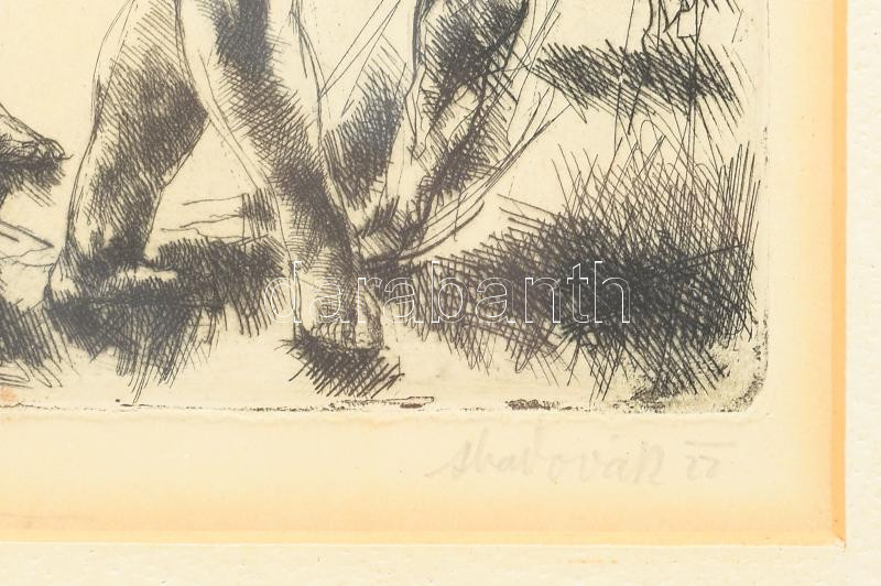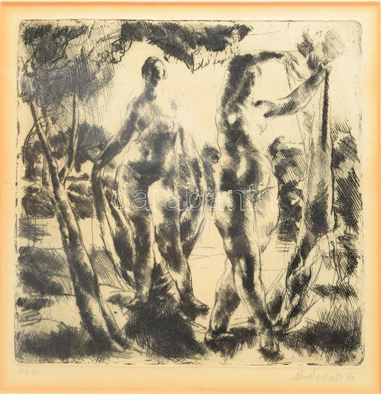 Aba-Novák Vilmos (1894-1941): Fürdőzők (női aktok). Rézkarc, papír, jelzett, számozott (XIX.44), üvegezett fakeretben, hátoldalán Vajda Zoltán budapesti képkeretező korabeli címkéjével, 19x19 cm / Vilmos Aba-Novák (1894-1941): Bathing nudes. Etching on paper, signed, numbered, framed. 19x19 cm