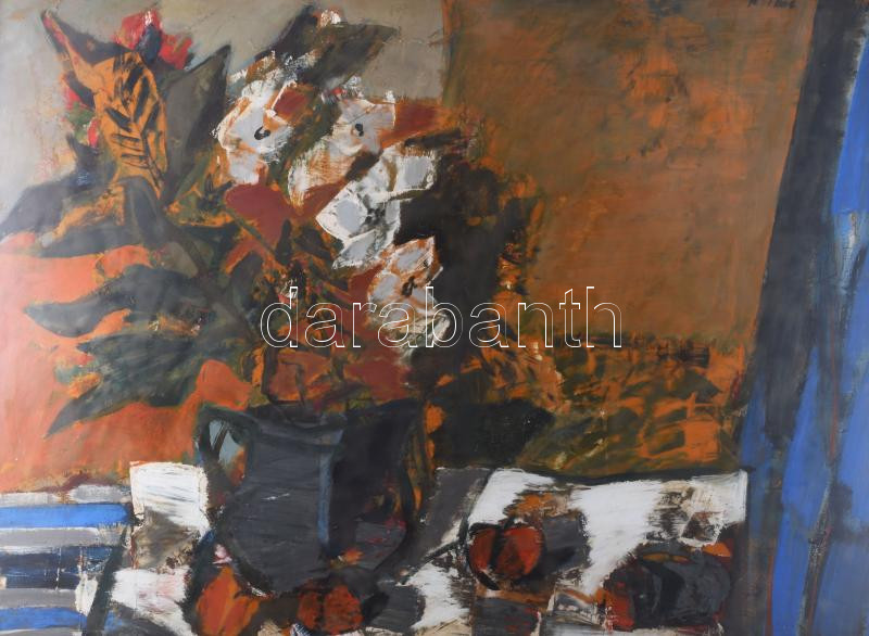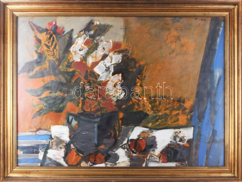 Description: Klimó Károly (1936-): Csendélet. Olaj, farost, jelezve jobbra fent. Hátoldalán Képcsarnok Vállalat címkéjével. Üvegezett fa keretben. 60x80 cm / Károly Klimó (1936-): Still life. Oil on wood fibre. Signed. With Képcsarnok Company label on the reverse. Framed. 60x80 cm