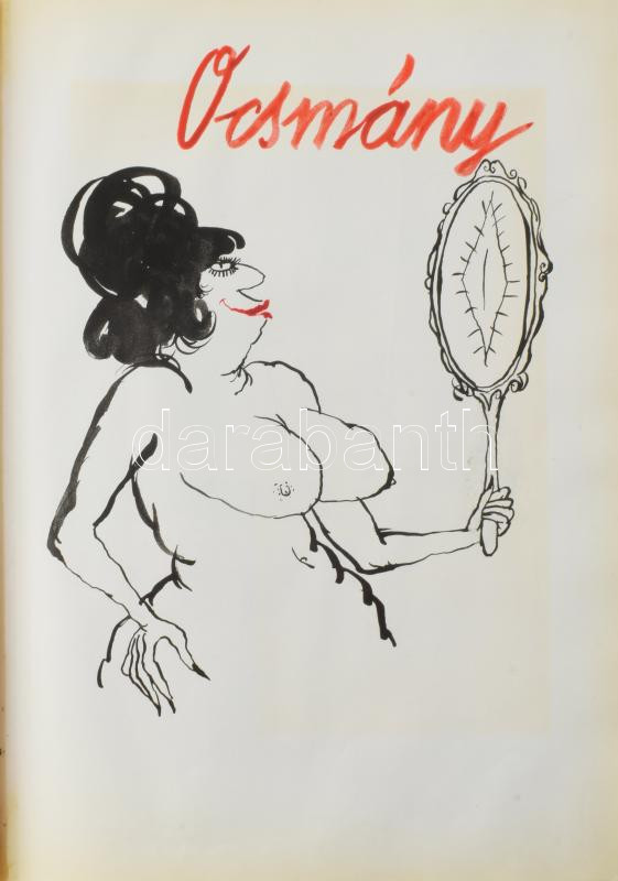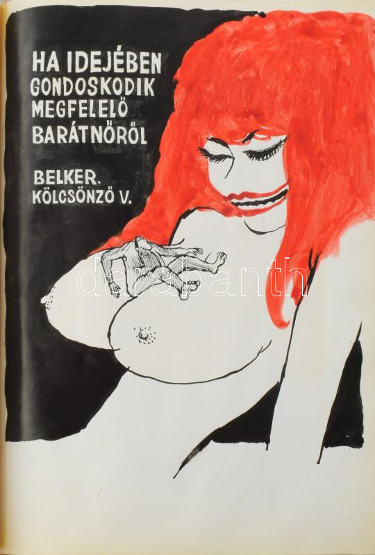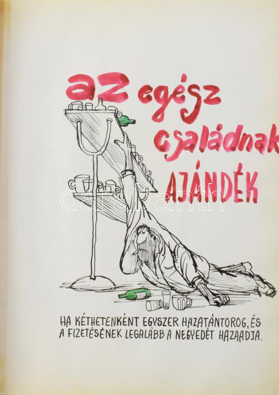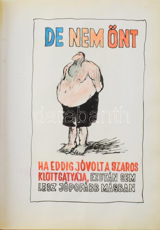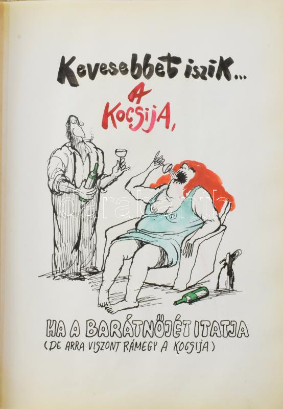 Description: Rau Tibor (1934-2009), 26 db mű: Kiváló áruk fóruma - anti reklám, 1975. Mappa 26 db, részben erotikus karikatúrával. Akvarell, tus, kollázs. Jelzett a borítón (egyes lapok jelzés nélkül). Mappába ragasztva. 29×21,5 cm