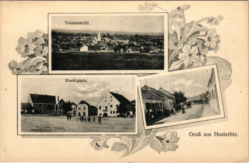 1909 Hosteradice, Hosterlitz (Znojmo); Totalansicht, Marktplatz / general view, market square, street. Art Nouveau, floral (EK)
