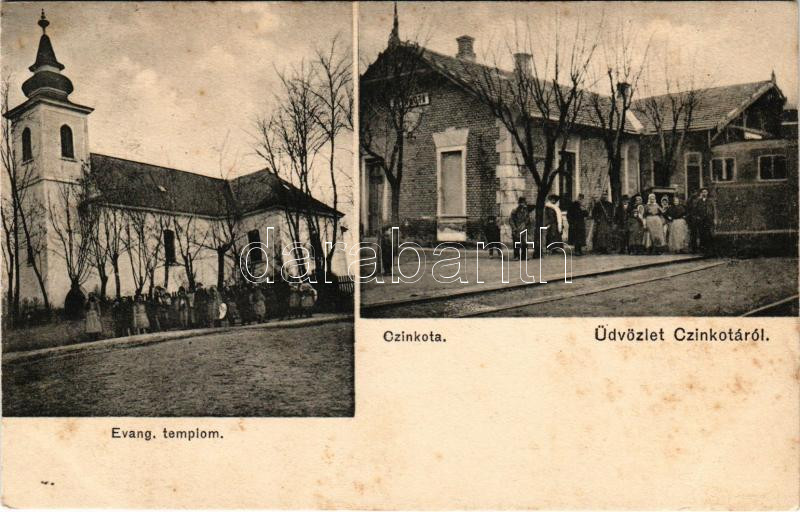 1908 Budapest XVI. Cinkota, HÉV (Helyiérdekű Vasút) vasútállomás, vonat, Evangélikus templom. Vános Manó kiadása (fl)
