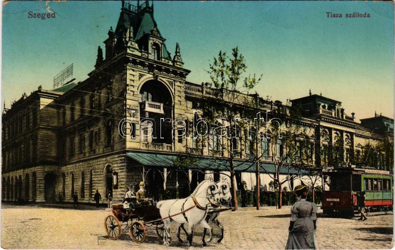 1915 Szeged, Tisza szálloda, villamos, hintó montázs (EK)