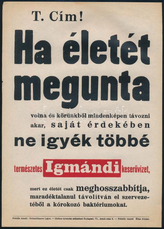 "Ha életét megunta (...)", Igmándi keserűvíz kisplakát, papír, Globus-Nyomda, Bp., lapszéli egészen apró szakadással, 24×17 cm