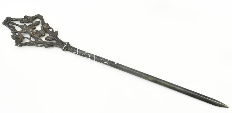 Nyúl figurával díszített levélbontó tőr, kopással, h: 22,5 cm
