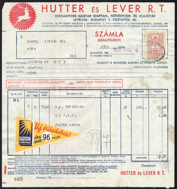 1938 Bp., Hutter és Lever R.T. fejléces számla
