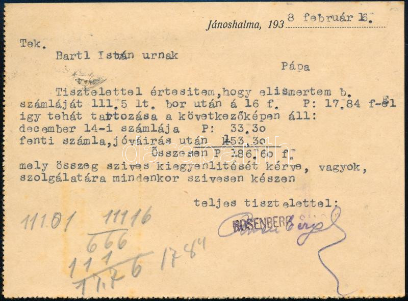 1938 Jánoshalma , Rosenberg Sándor bor és szesz ügynöksége, levelezőla...