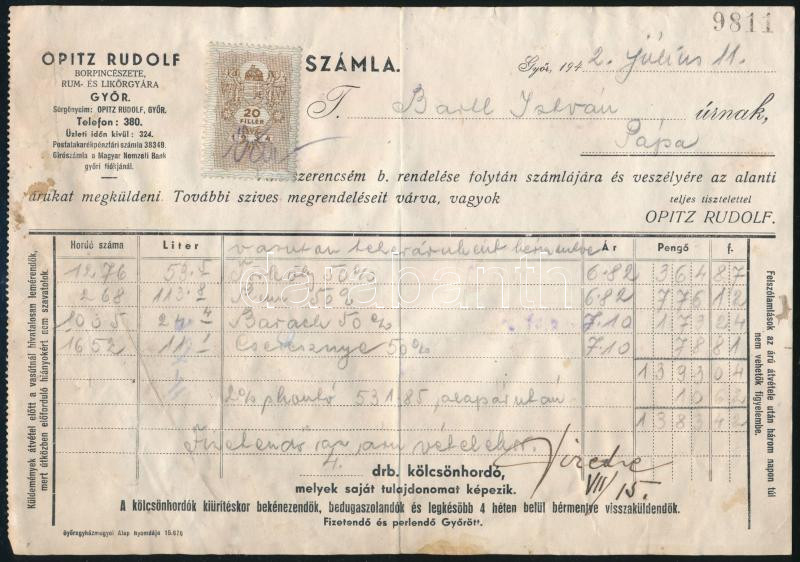 1942 Opitz Rudolf Borpincészete, Rum-és Likőrgyára, Győr fejléces szám...