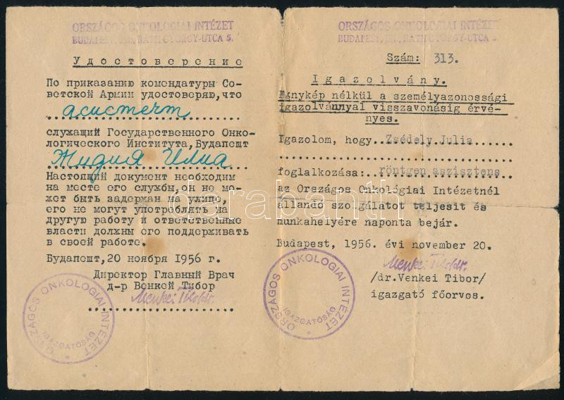1956 Bp., Országos Onkológiai Intézet kétnyelvű igazolvány