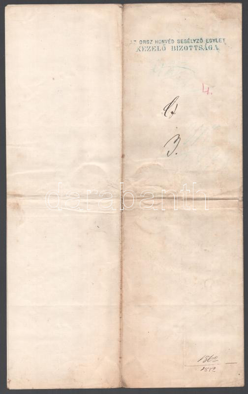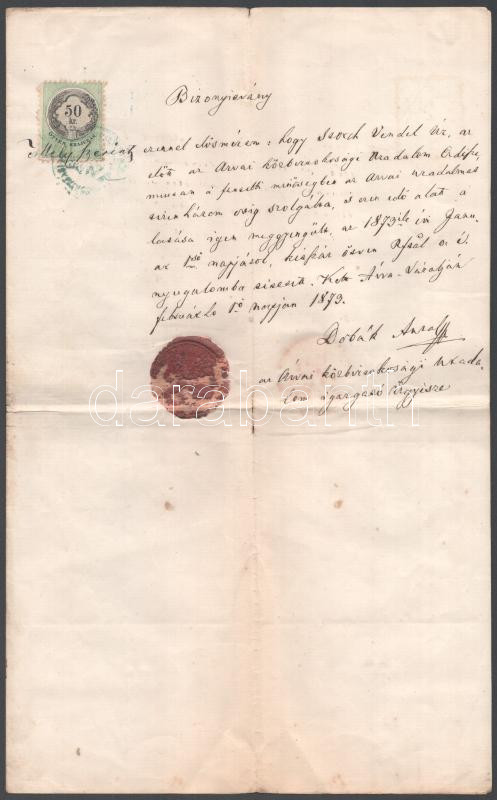 1873 Storch Vendel (1827-1886 után) 1848-49-es szabadságharcos, komáromi várőr részére kiállított bizonyítvány, amelyben igazolják, hogy az árvai közbirtokossági uradalomnál szolgált. Sérült viaszpecséttel, Dobák Antal árvai közbirtokossági uradalom igazgató ügyésze aláírásával, 50 krajczár okmánybélyeggel, hátoldalán az Orsz. Honvéd Segélyző Egylet Kezelő Bizottsága bélyegzőjével. Hajtásnyomokkal, kisebb szakadással. Storch Vendel a szabadságharcban 1848. júniusától közvitéz a 9. (kassai) honvédzászlóaljnál. Részt vesz a délvidéki harcokban. Aug. 16- tizedes, majd őrmester. 1849. jún. 28 (1.)- hadnagy a 63. zászlóaljnál, a II. hadtestben. A komáromi várőrséggel teszi le a fegyvert. 1850. jan. 24. besorozzák a 36. gyalogezredhez. 1852. okt. 5. leszerelik. 1867. volt főhadnagyként (?!) az Árva megyei Honvédegylet tagja.