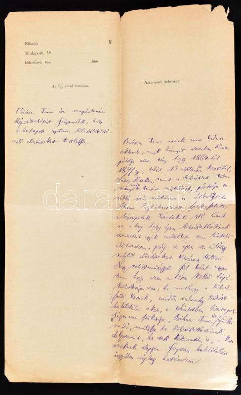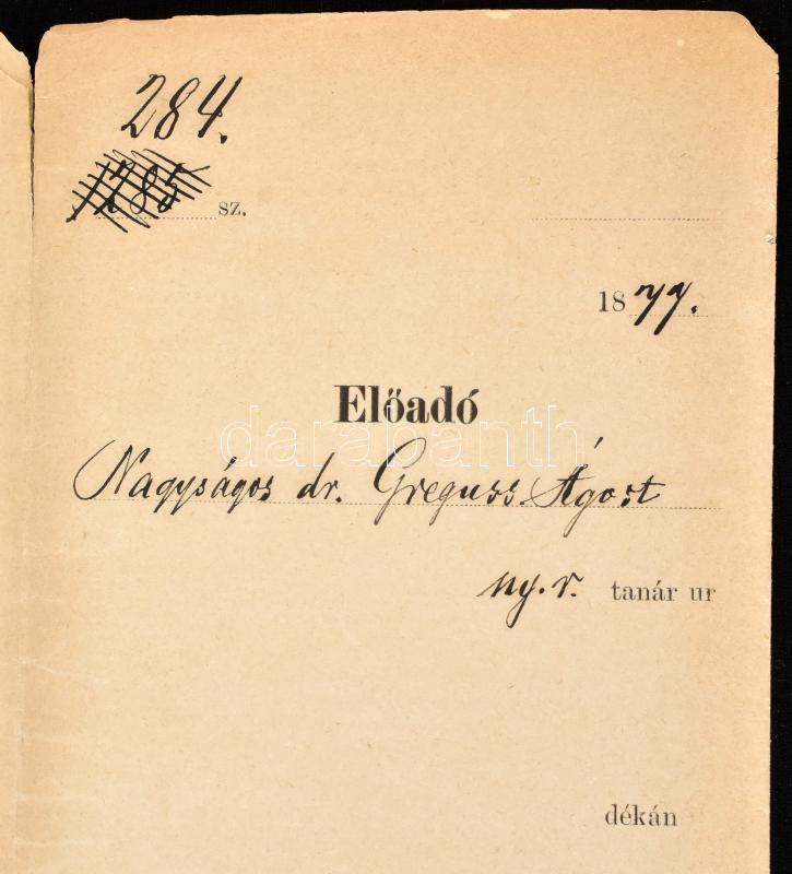 1877 Greguss Ágost (1825-1882) bölcseleti doktor, egyetemi tanár, esztéta, az MTA tag, a Kisfaludy Társaság másodelnökének saját kézzel írt bírálta Bihari Imre (1829-1882?) református tanár, filozófus, korábban Sárospatakon bölcselettanár, folyamodványára, hogy képesítés hiányában is tarthasson előadásokat a Budapesti Egyetemen, aláírás nélkül.