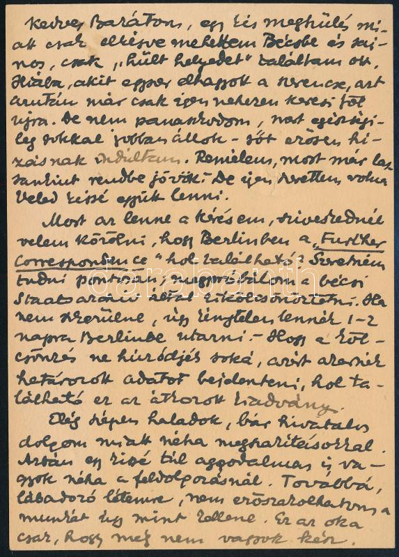 Description: 1925 Hajnal István (1892-1956) Széchenyi-díjas történész saját kézzel írt levele képeslapon, saját kezű aláírásával, Jánossy Dénes (1891-1966) levéltáros, történész részére, berlini - bécsi kutatással kapcsolatban.
