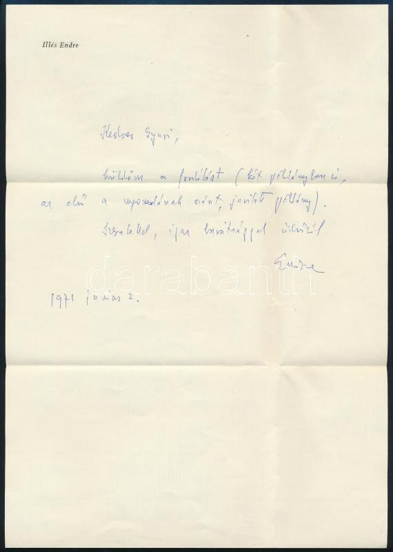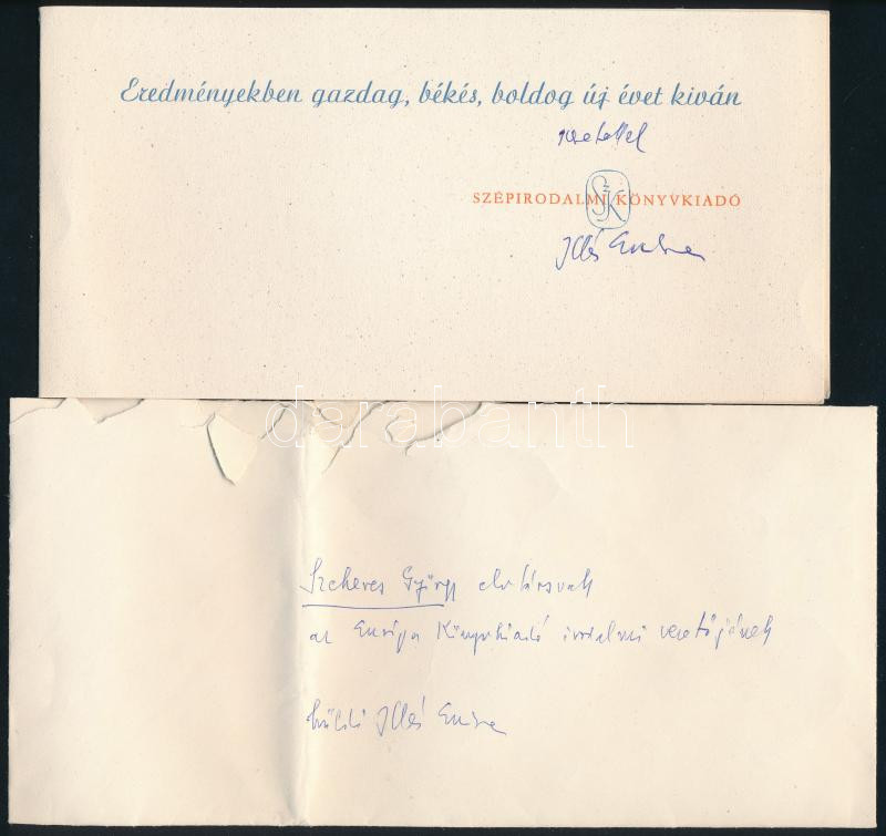 1971 Illés Endre (1902-1986) író, drámaíró, műfordító, műkritikus, a Szépirodalmi Könyvkiadó vezetőjének saját kézzel írt levele megküldött fordítások ügyében Szekeres György (1914-1973) újságíró, műfordító, az Európa Kiadó irodalmi szerkesztőjének részére, saját kezű aláírásával, saját fejléces papírján. + 1964 Illés Endre saját kézzel írt újévi üdvözlő képeslapja, saját kezű aláírásával Szekeres György részére + egy boríték Illés Endre által Szekeres Györgynek címezve, saját kezű aláírásával