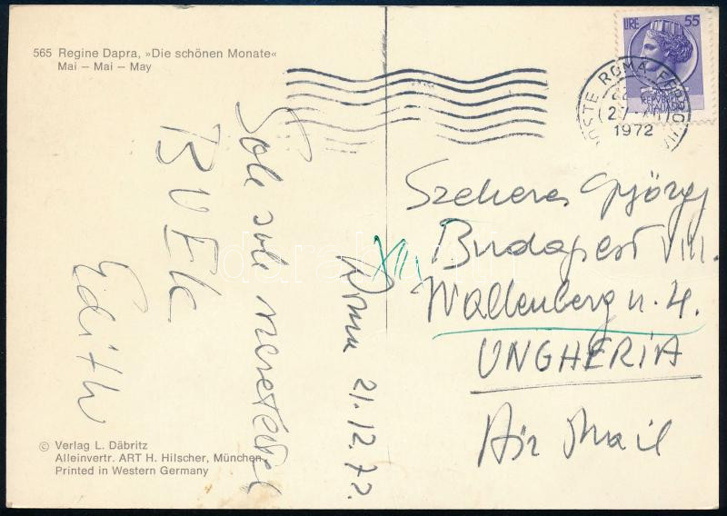 1972 Edith Bruck (1931-) magyar származású olasz költő, műfordító, auschwitzi túlélő, az "életben maradt Anna Frank", Nelo Risi (1920-2015) olasz filmrendező, költő, műfordító feleségének saját kézzel írt újévi üdvözlő lapja, Szekeres György (1914-1973) újságíró, műfordító, az Európa Kiadó főszerkesztőjének részére, saját kezű aláírásával.