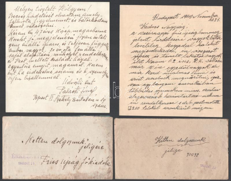 2 db válaszlevél apróhirdetésre "Ketten dolgozunk" jelige. 1940 Okt. 21-22.