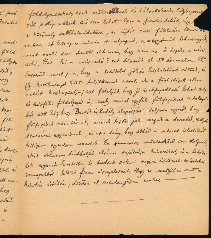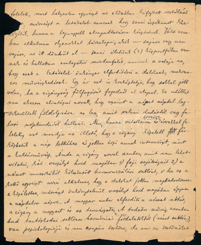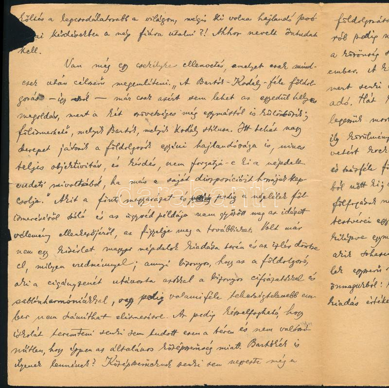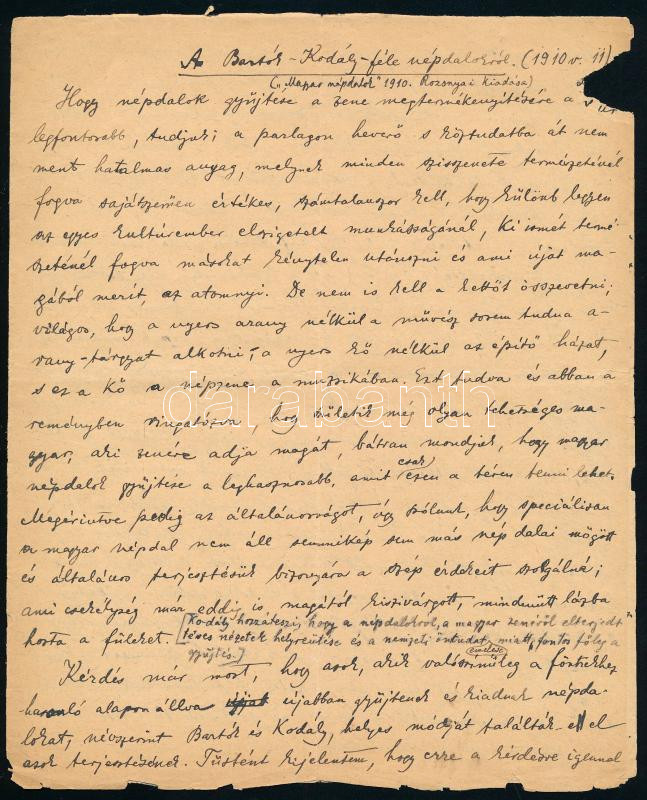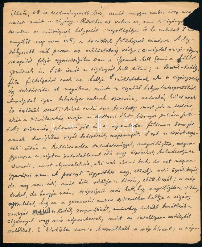 cca 1910 után Molnár Antal (1890-1983) zenetörténész, zeneszerzÅ‘ és zeneesztéta, brácsaművész "A Bartók-Kodály-féle népdalokról. ("Magyar népdalok" 1910. Rozsynai kiadása.)" c. Ãrásának kézirata, aláÃrás nélkül, sérült, lapszéli hiányokkal, 5 beÃrt oldal