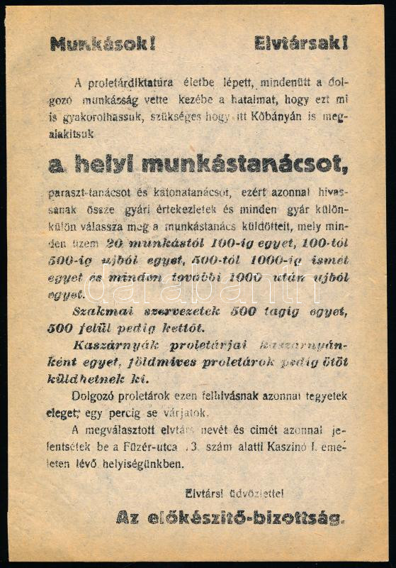1919 Tanácsköztársaság munkástanács röplap 21 cm