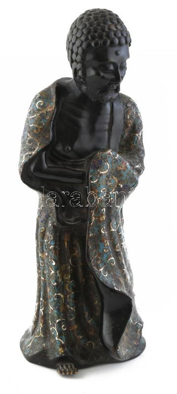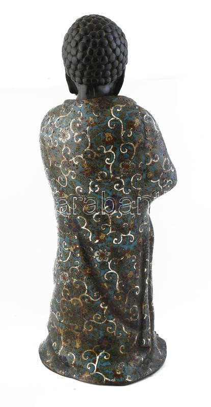 Description: Nagy méretű antik bronz buddhista szobor, tűzzománcos díszítéssel, cca XIX. sz. vége, lezárt, felszentelt állapotban, kopással, jelzés nélkül, m: 43 cm