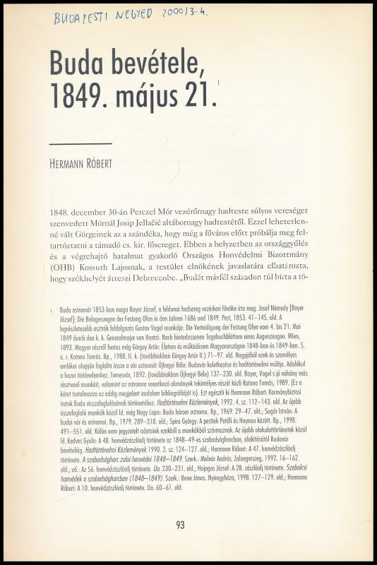 Description: Hermann Róbert: Buda bevétele, 1849. május 21. A szerző, Hermann Róbert (1963-) történész által DEDIKÁLT példány [Különlenyomat, Budapesti Negyed 2000/3-4.], 93-143 p.