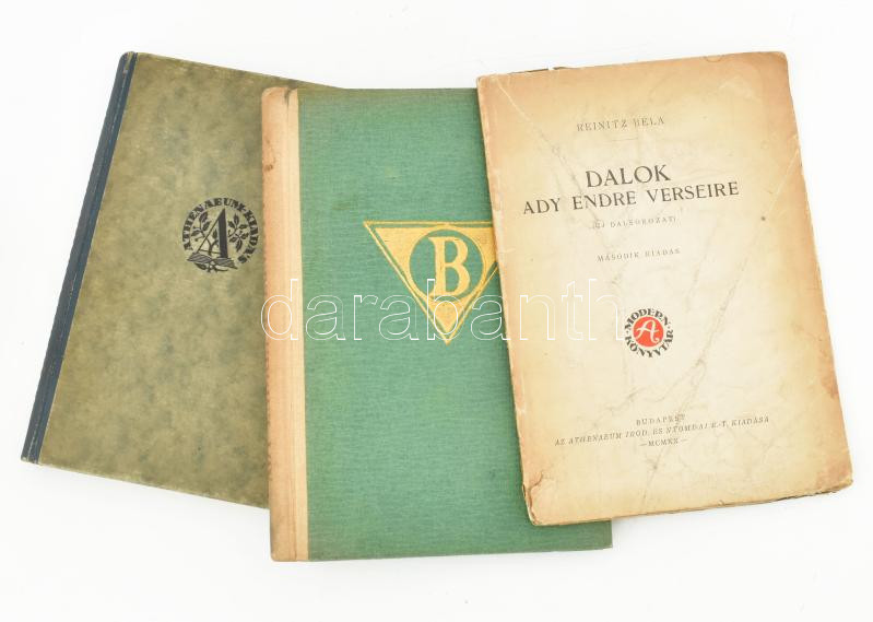 Ady Endre 2 műve: Ady Endre: A tegnapi Páris. A tegnapi Páris anyagát összegyűjtötte és sajtó alá rendezte Kovách Aladár. Bp., é.n., Bolyai Akadémia, 128 p. Egy fekete-fehér rajzzal, Rippl Rónai József Ady portréjával illusztrálva. Kiadói félvászon kötésben.; Ady Endre: Szeretném, ha szeretnének. Bp.,én., Athenaeum, 200 p. Ötödik kiadás. Kiadói kissé kopott borítóval. + Reinitz Béla: Dalok Ady Endre verseire. (Új dalsorozat.) Modern Könyvtár. Bp., 1920, Athenaeum, IV+4+33 p. Kiadói papírkötés, szakadt, foltos, gyűrött borítóval.