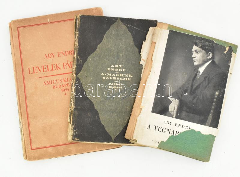 Ady Endre 3 műve: Ady Endre: A magunk szerelme. Bp., 1919, Pallas Irodalmi és Nyomdai Rt.,120+2 p. Második kiadás. Kiadói kopott papírkötés, sérült gerinccel, kopott borítóval, számos bejegyzéssel, névbejegyzéssel, firkával.; Ady Endre: A tegnapi Páris. A tegnapi Páris anyagát összegyűjtötte és sajtó alá rendezte Kovách Aladár. Bp., é.n., Bolyai Akadémia, 128 p. Egy fekete-fehér rajzzal, Rippl Rónai József Ady portréjával illusztrálva. Kiadói félvászon kötésben, ketté szakadt, sérült papír védőborítóval.; Ady Endre: Levelek Párisból. Bp., 1924, Amicus, 176 p. Kiadói kartonált papírkötés, kopott, foltos borítóval, hiányzó gerinccel. Számozatlan példány.;
