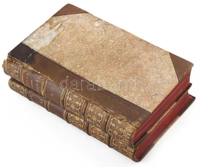 Description: Arany János összes munkái. III. kötet / 2. kötet. Elbeszélő költemények. + IV. Kötet / 3 kötet: Elbeszélő és elegyes költemények Bp., 1884,88. Ráth Mór. Kiadói, festett, aranyozott félbőr-kötésben, festett lapszélekkel. Egyik gerinc erősen sérült foltos, másik kissé deformálódott, néhány lapon sérülések