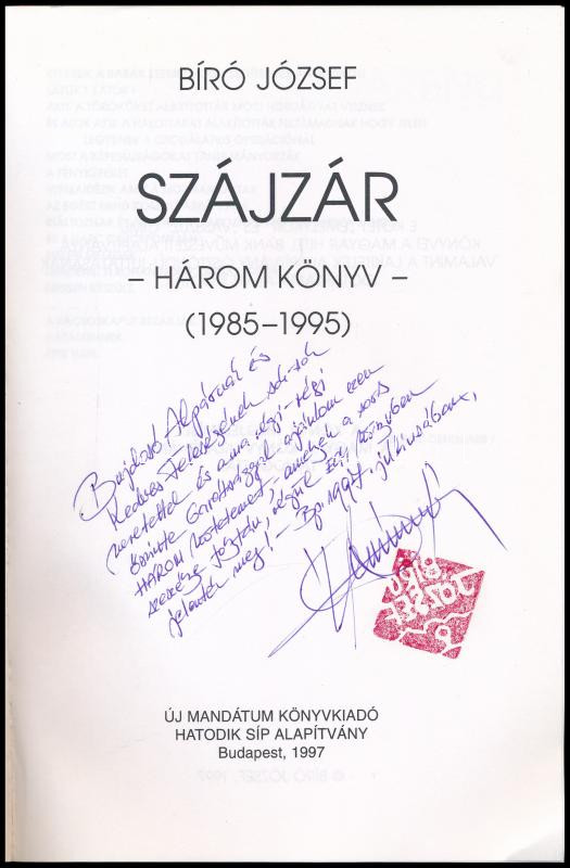 Description: Bíró József: Szájzár. Három könyv. (1985-1995.) A szerző, Bíró József (1951- ) költő által Bujdosó Alpár (1935-2021) költő, mérnök, a Magyar Műhely szerkesztője a magyar avantgarde kiemelkedő alakja és felesége részére DEDIKÁLT példány. Bp., 1997, Új Mandátum - Hatodik Síp Alapítvány. Kiadói papírkötés.