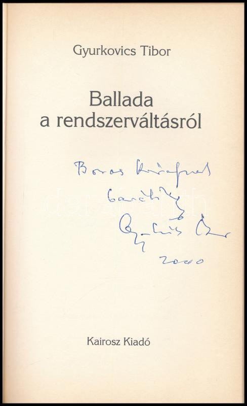 Gyurkovics Tibor: Ballada a rendszerváltásról. Gyurkovics Tibor (1931-2008) költő által DEDIKÁLT példány. Bp., 2000, Kairosz. Kiadói papírkötés.