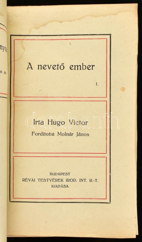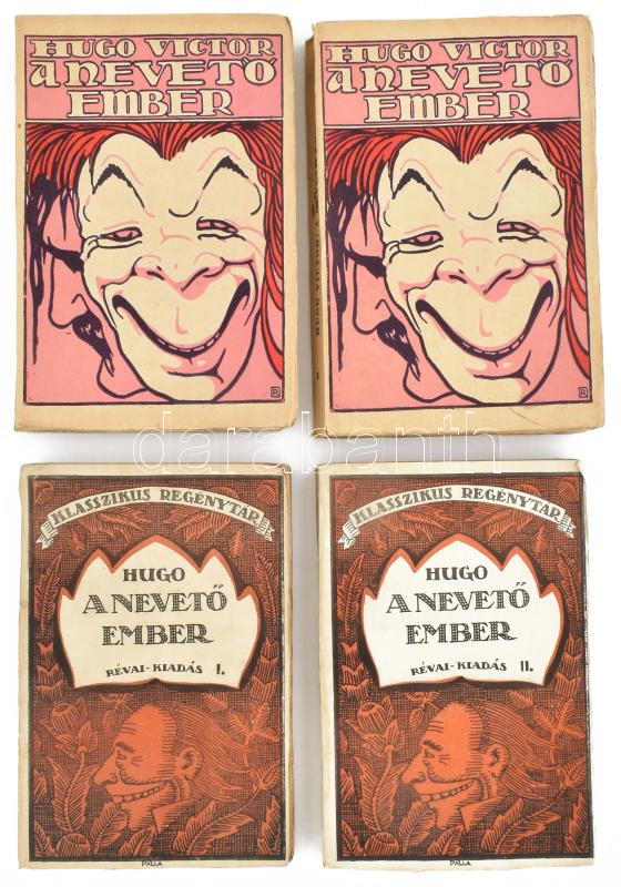 Hugo Victor: A nevető ember I-II. köt. Ford.: Hajós Kornél. Bp., én., Népszava, (Világosság-ny.) Kiadói szecessziós illusztrált papírkötés, kissé foltos és kissé sérült gerinccel, szép állapotban. + Hugo Victor: A nevető ember I-II. köt. Ford.: Molnár János. Bp., én., Révai Testvérek. Klasszikus regénytár. Kiadói illusztrált papírkötés (Pálla Jenő), kissé foltos és kissé sérült gerinccel, borítók hátoldala kissé foltos.