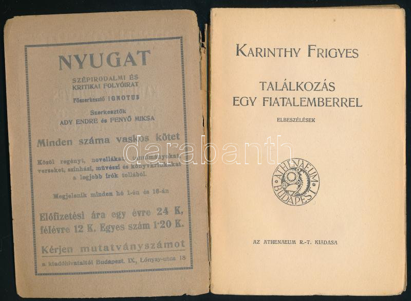 Karinthy Frigyes: Találkozás egy fiatalemberrel. Modern könyvtár 314-3... https://www.darabanth.com/en/450-Online-auction/450.0/Books/Books-Other-rarities~2000028/Karinthy-Frigyes-Talalkozas-egy-fiatalemberrel-Modern-konyvtar-314-315-sz-Bp-1913-Athenae~II2987908