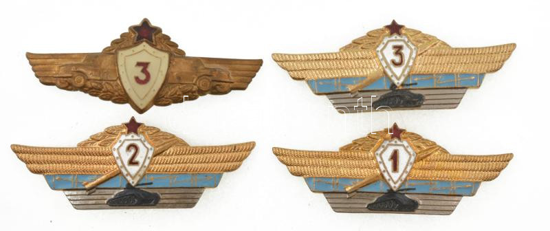 ~1950. "Magyar Néphadsereg 3. osztályú páncélos- és gépjárművezető" festett, részben zománcozott bronz kitüntető jelvény + Szovjetunió ~1970. "1., 2. és 3. osztályú harckocsizó" aranyozott, zománcozott fém jelvény (3xklf) T:AU,XF Hungary ~1950. ~1950. "Hungarian People's Army 3rd Class Armored and Motor Vehicle Driver" painted, partially enameled bronze medal badge + Soviet Union ~1970. "1st, 2nd and 3rd class trooper badge" gilt, enamelled (3xdiff) C:AU,XF