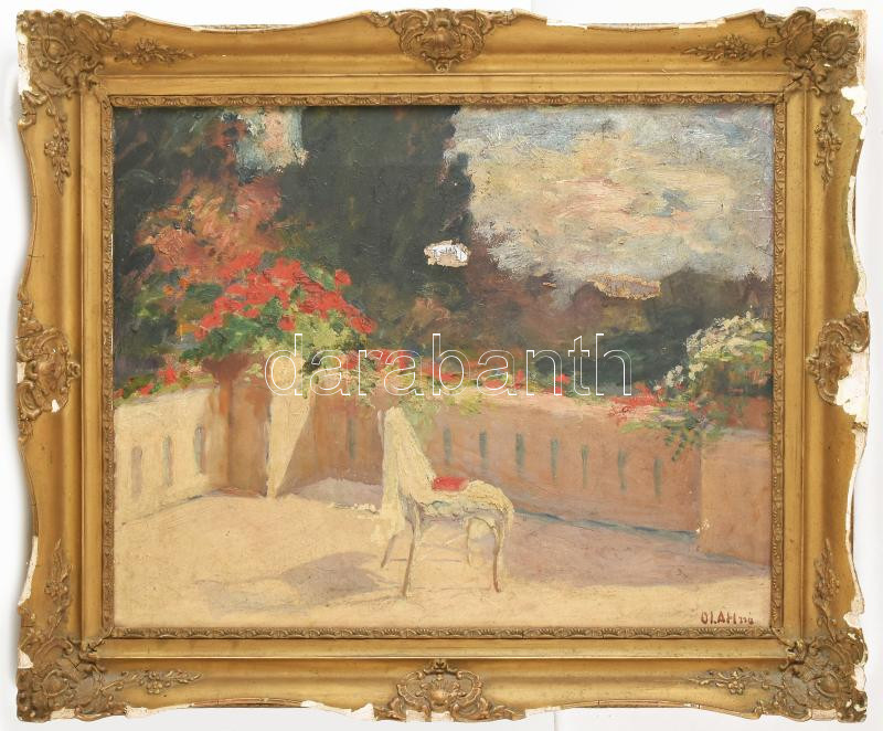 Oláh jelzéssel (Oláh Gusztávné Fodor Róza?): Napfényes terasz. Olaj, v...