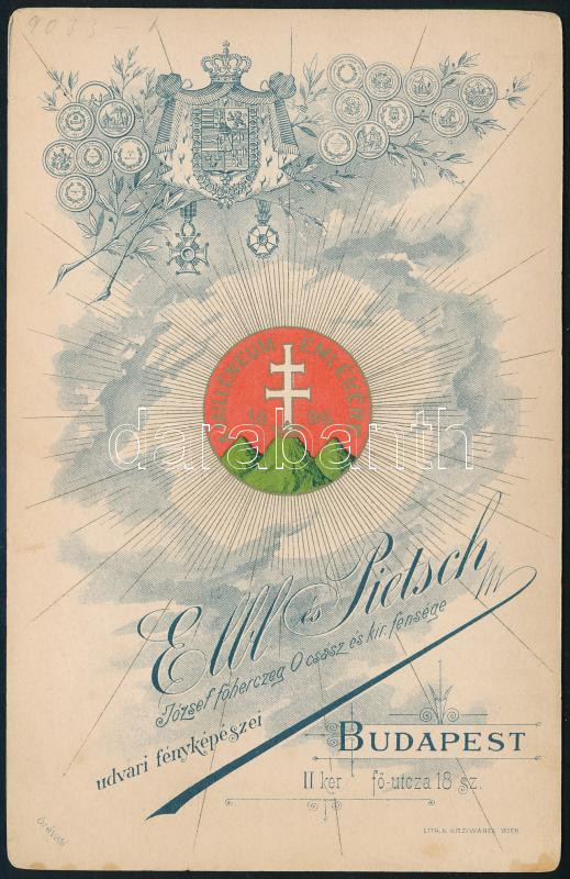 Description: 1896 Nemes Hanzély Gyula a Balassagyarmati Bank későbbi elnökének és Z. Szalatsy Rezső aláírt portréfotója, keményhátú fotó Elbl és Pietsch budapesti műterméből, a verzón a magyar nagycímerrel, és aranyozott, litografált 'A Milleneum Emlékére 1896' felirattal hármashalmos-kettős keresztes címer körül, 16x10 cm