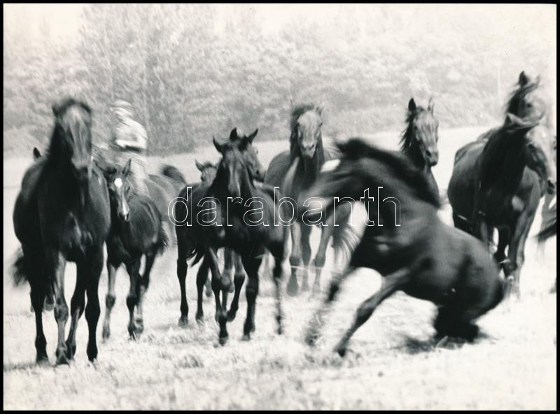 1974 Pomozi Istvánné budapesti fotográfus feliratozott vintage fotóművészeti alkotása (Vágta), ezüst zselatinos fotópapíron, 18x24 cm