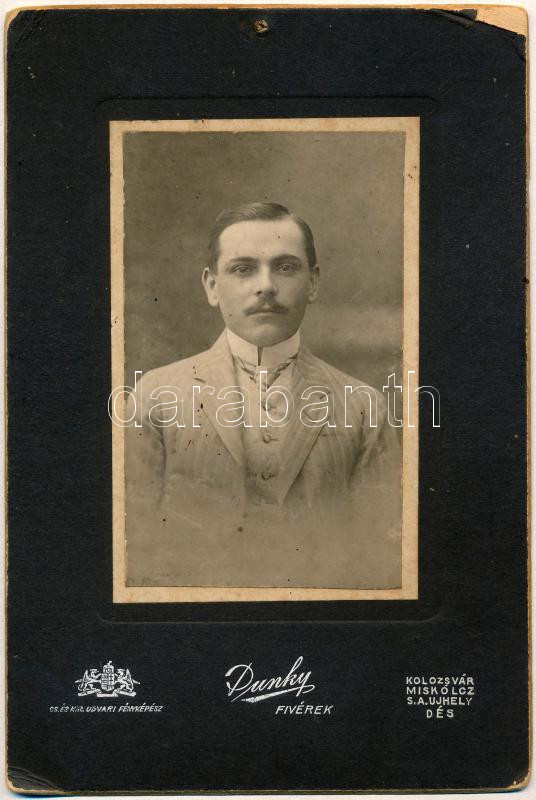 cca 1910 Férfiportré, keményhátú fotó a Dunky Fivérek kolozsvári műter...